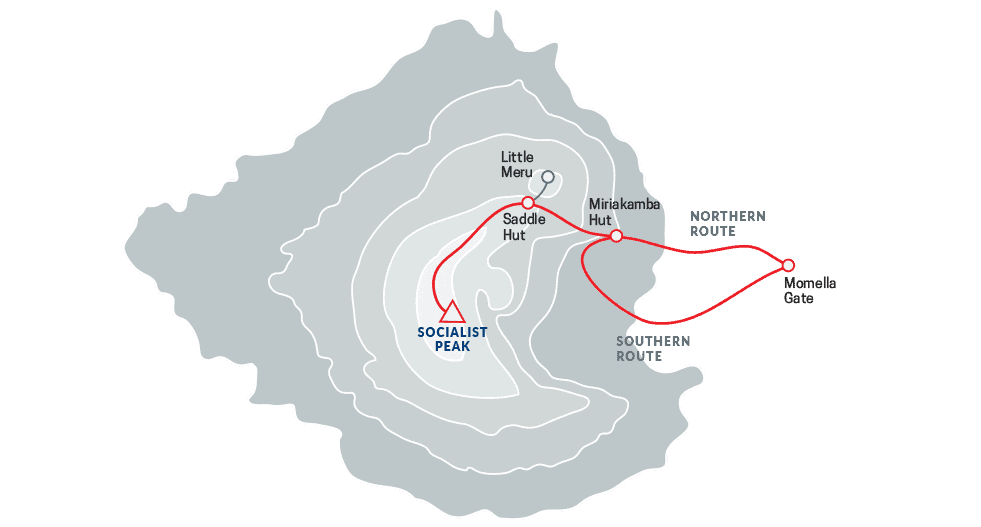 We wake up just after midnight and have a light meal to keep our energies high. Once done with the meal we start the final ascent to Socialist Peak. This ascent will be steep and we will be making our way through gravel and rocky cliffs. This is the most mentally and physically challenging portion of the trek. Once at the summit, you will enjoy the magnificent views of the Meru Crater and the Ash cone. There are chances that one might catch a glimpse of wildlife like mountain Reedbucks and Klipspringers over the rocky ridge.